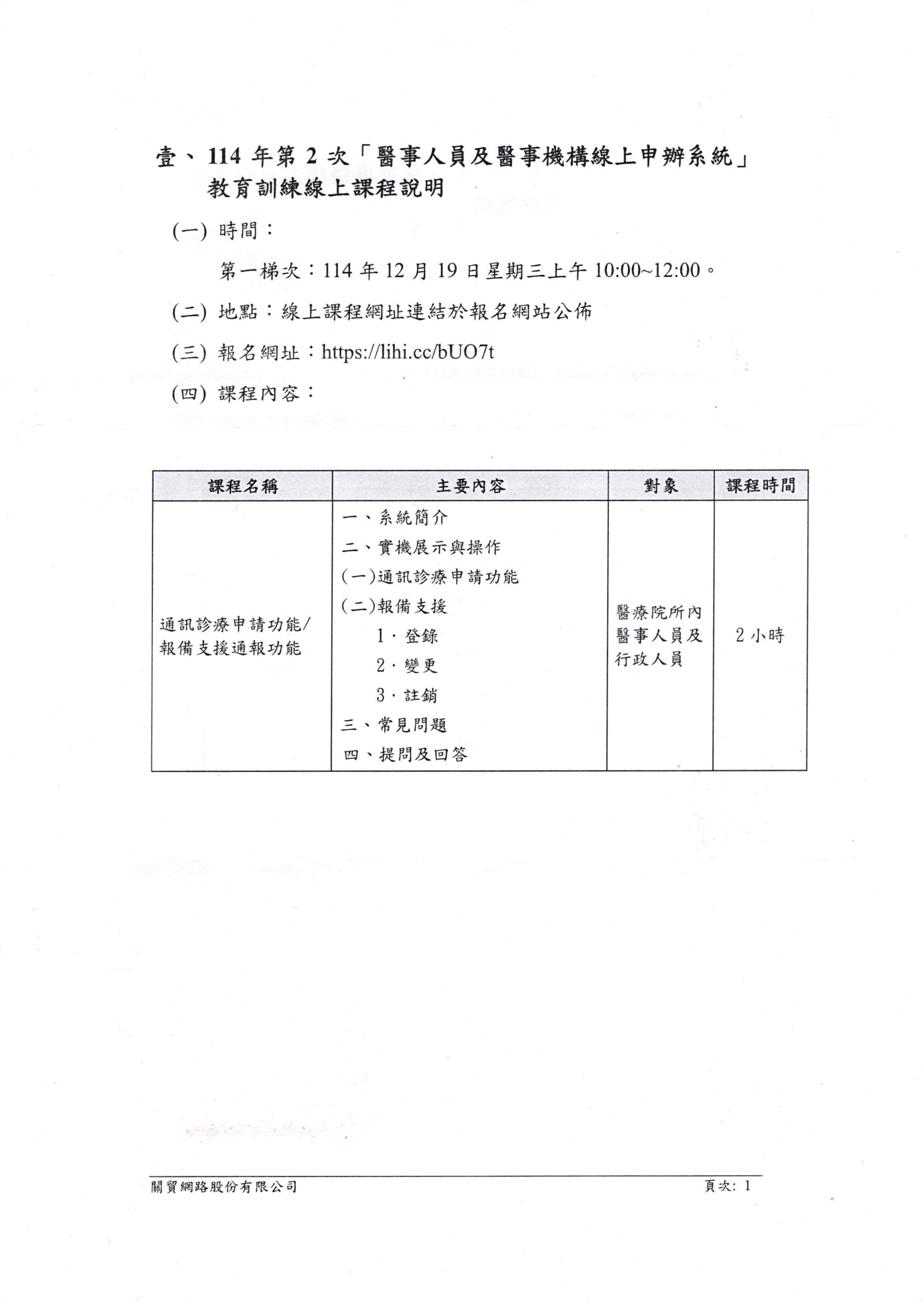 衛生福利部 114 年「醫事人員及醫事機構線上申辦系統」教育訓練課程,相關資訊如下: