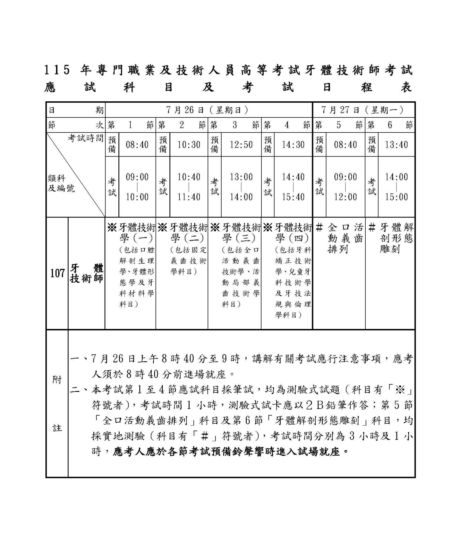發佈時間: 2026-04-01 115年度牙體技術師考試資訊 115年度牙體技術師考試資訊 一、考試日期及地點: 高等考試牙體技術師考試採筆試及實地測驗,於7月26日(星期日)至7月27日(星期一)在臺北考區舉行。 二、報名日期: 自115年4月7日(星期二)起至4月16日(星期四)下午5時止。 三、細節請詳閱 考選部牙體技術師考試公告