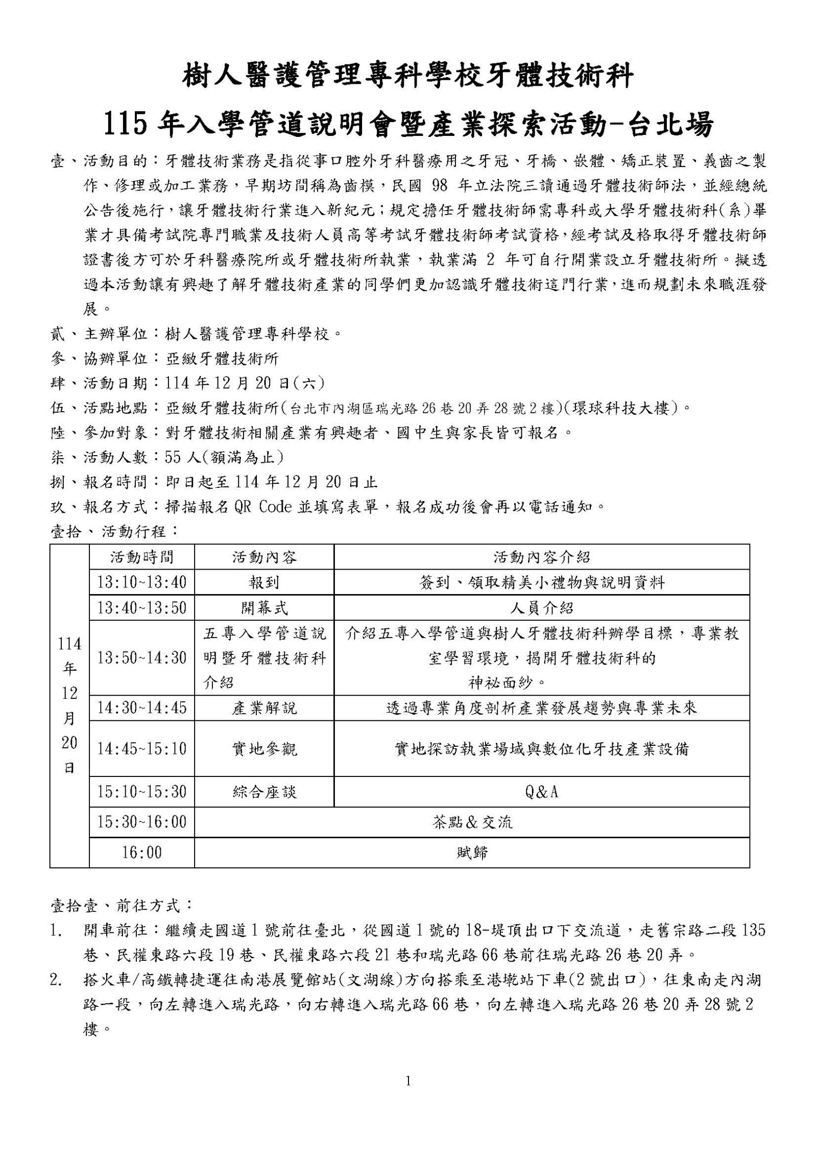 📢 轉知-樹人醫專牙體技術科 115 年入學管道說明會暨產業探索活動(台北場)