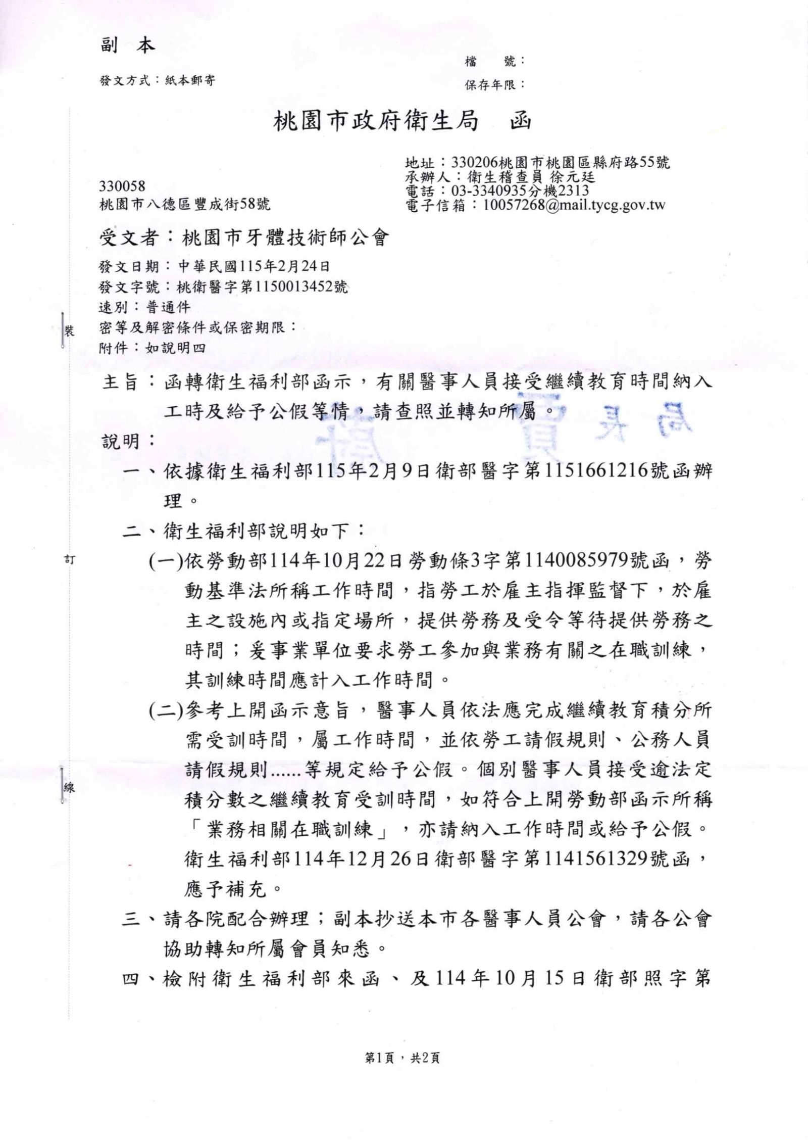 發佈時間: 2026-01-09 更新-醫事人員繼續教育學分相關規定宣導 🔹 繼續教育課程可視為工作時間 依據衛生福利部及勞動部相關函釋說明,若醫事人員依規定接受繼續教育訓練,且屬於業務相關之在職訓練,其受訓時間 得列入工作時間計算。 🔹 依法可申請公假 醫事人員因法定積分制度需完成之繼續教育課程,若屬於與工作相關之訓練,雇主應依相關規定 給予公假或將受訓時間納入工作時間。 詳細規範請詳閱公文內容。