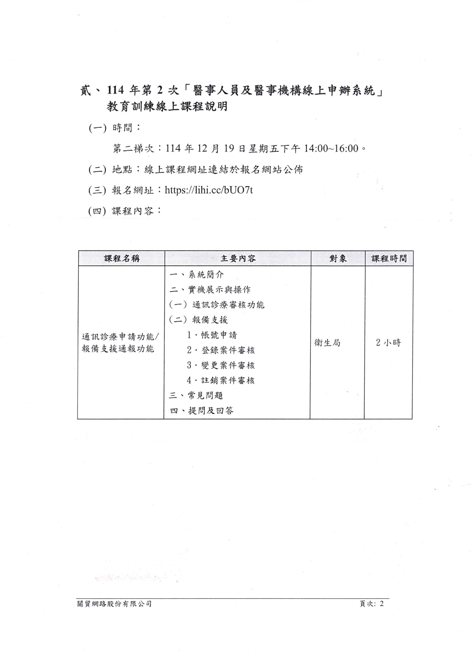 衛生福利部 114 年「醫事人員及醫事機構線上申辦系統」教育訓練課程,相關資訊如下: