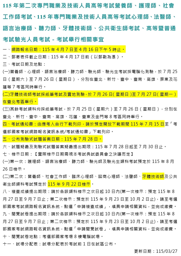發佈時間: 2026-04-01 115年度牙體技術師考試資訊 115年度牙體技術師考試資訊 一、考試日期及地點: 高等考試牙體技術師考試採筆試及實地測驗,於7月26日(星期日)至7月27日(星期一)在臺北考區舉行。 二、報名日期: 自115年4月7日(星期二)起至4月16日(星期四)下午5時止。 三、細節請詳閱 考選部牙體技術師考試公告