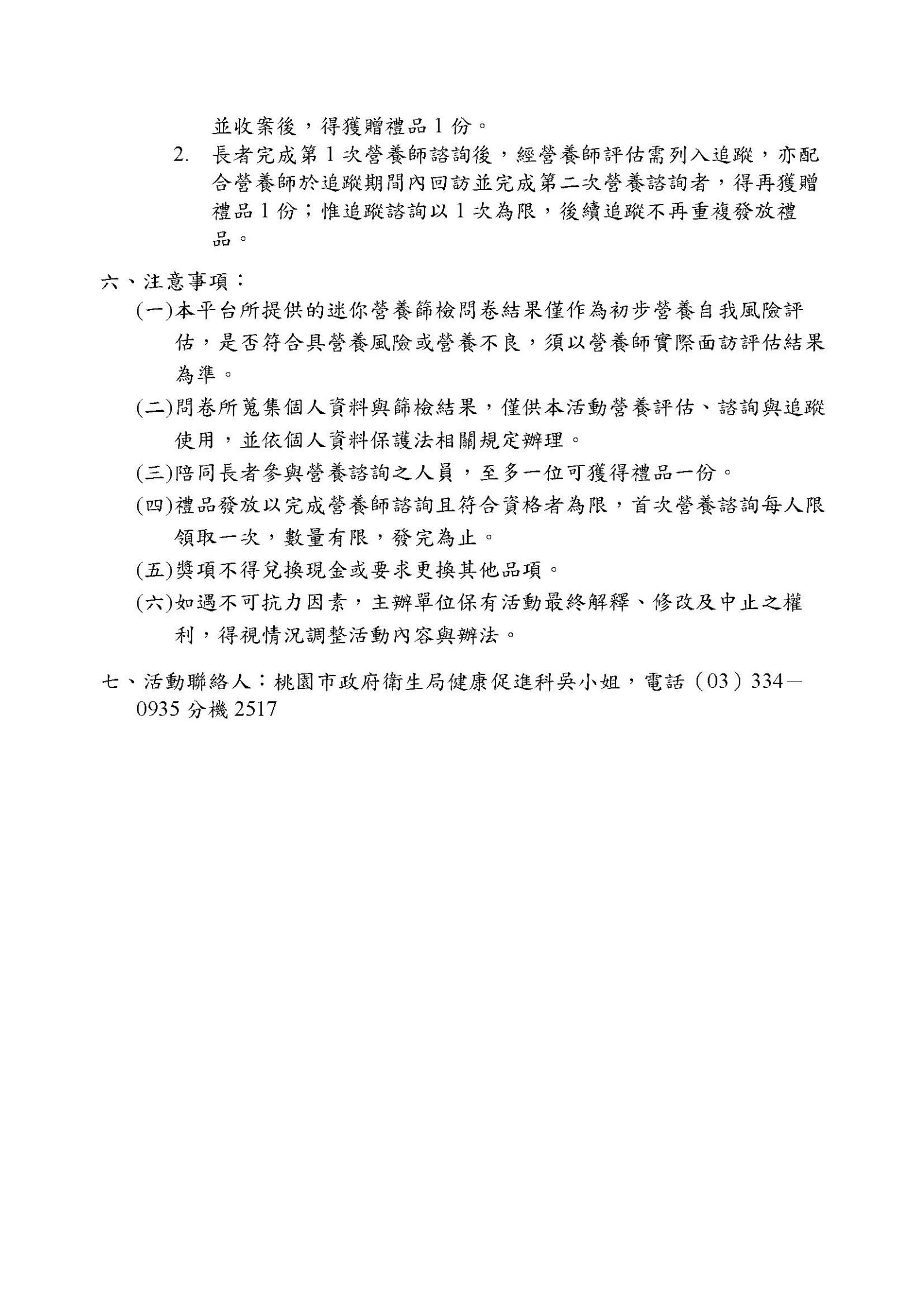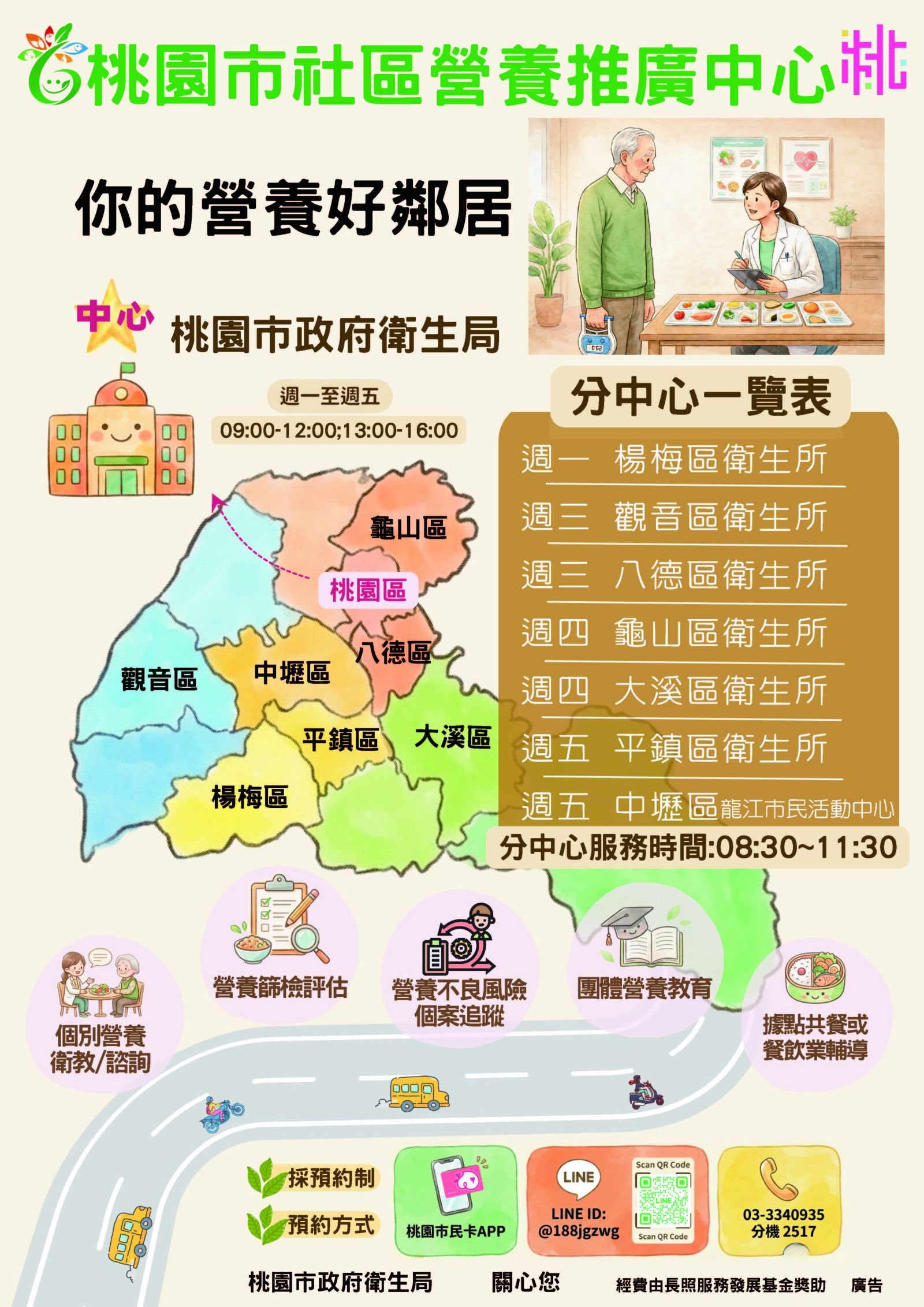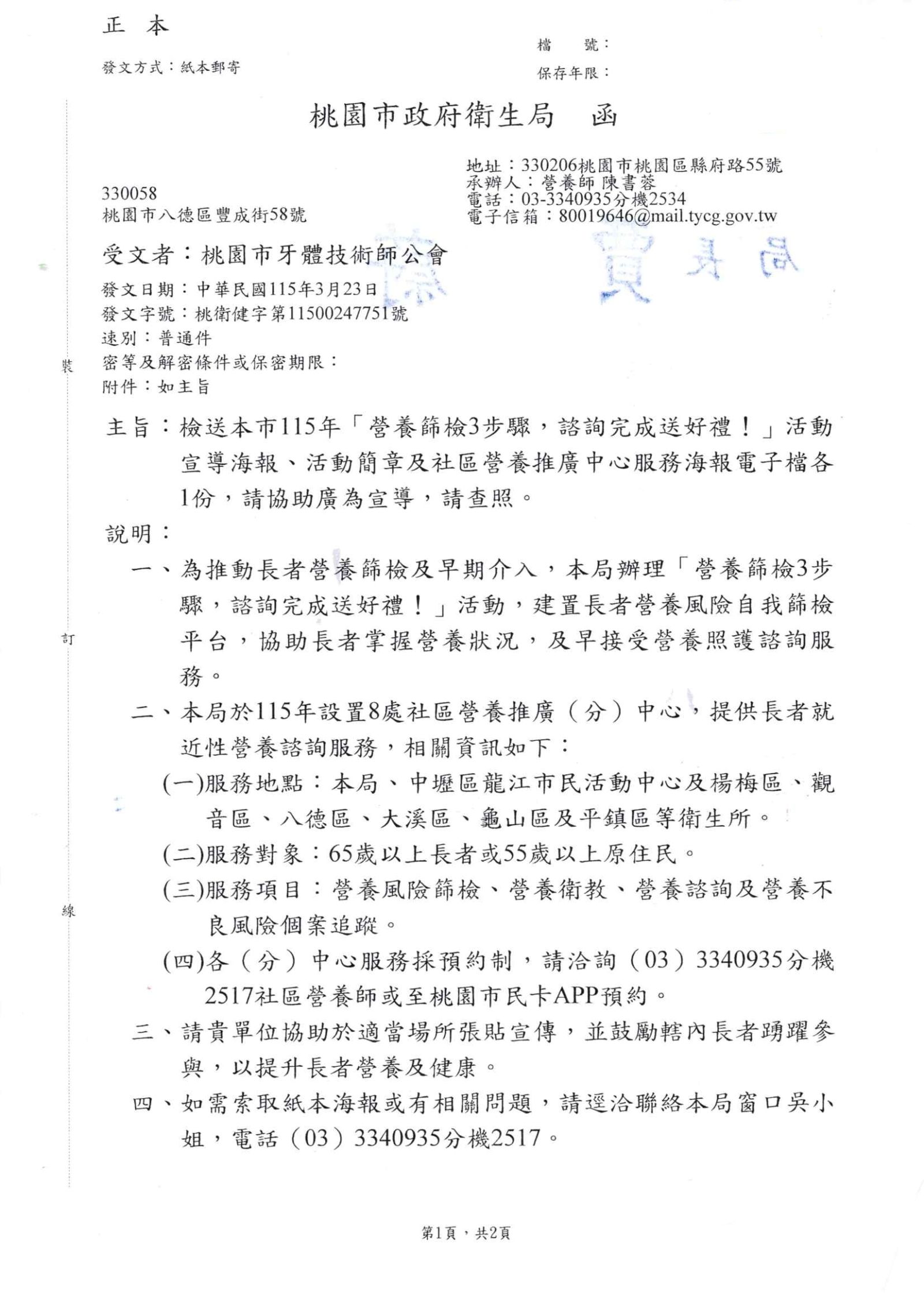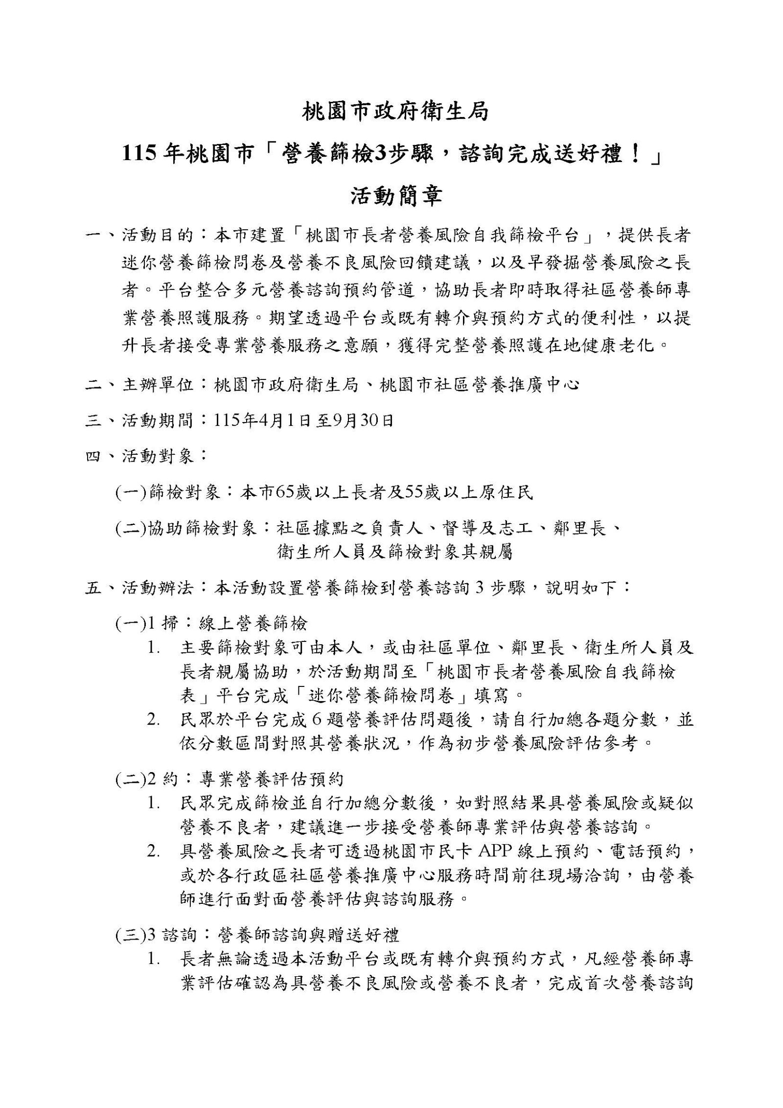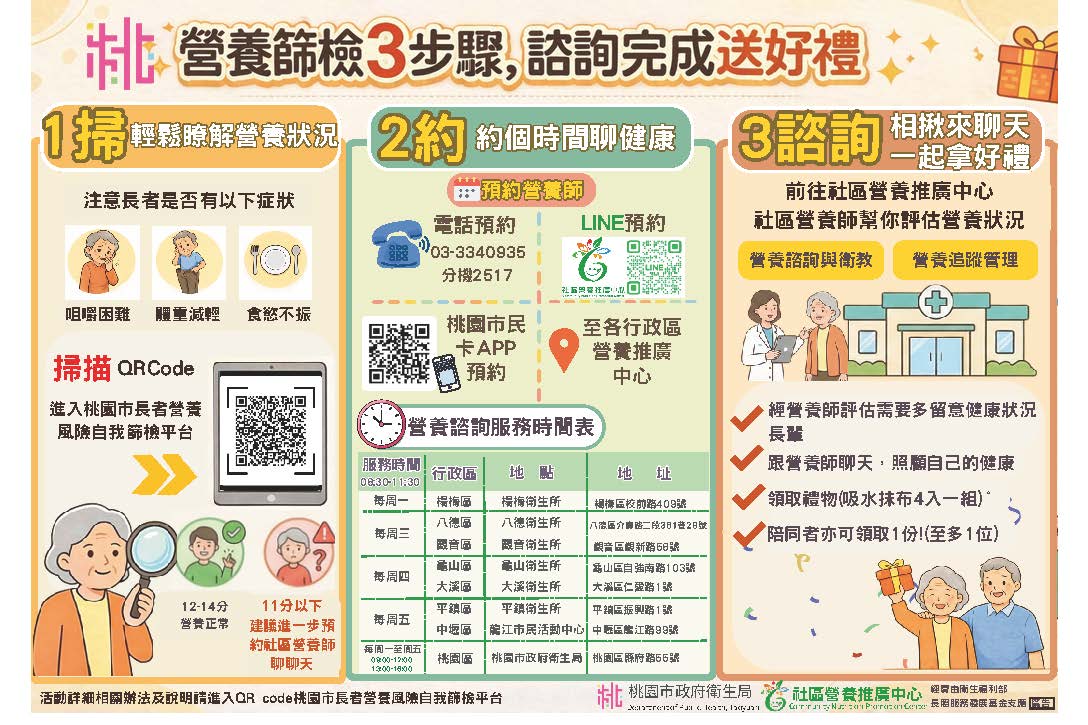桃園市政府衛生局為推動長者營養篩檢及早期介入,辦理「115年桃園市營養篩檢3步驟,諮詢完成送好禮!」活動,